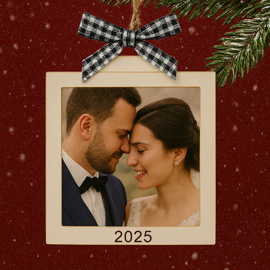 Celebrate your holiday season with this timeless simple interchangeable photo ornament. Feature your favorite photo magnet on this simplified ornament with rustic holiday accents, it’s the perfect keepsake to cherish year after year—or gift to a special couple