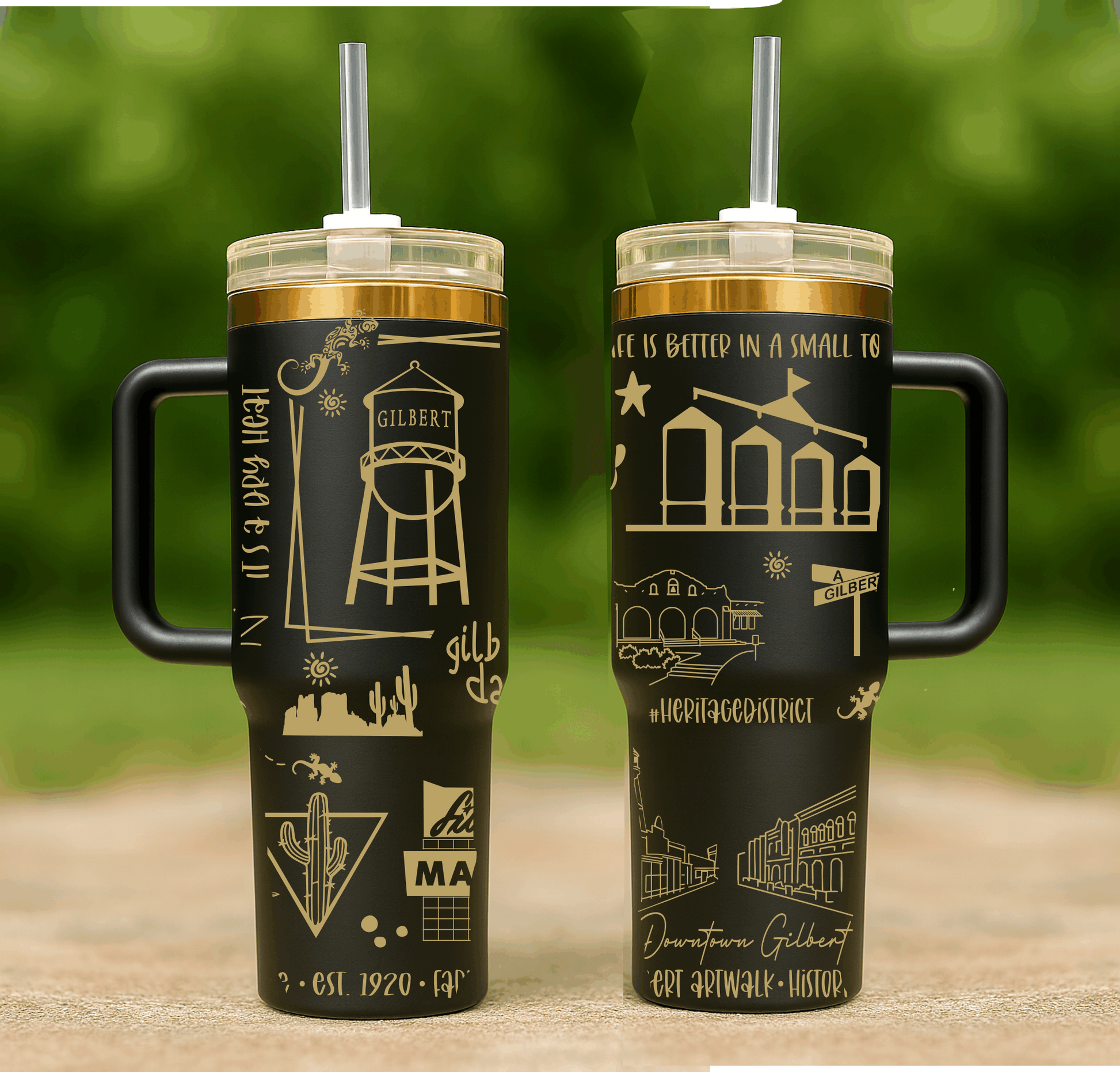 This 40oz Cream or Black with Gold engraved Gilbert Tumbler is more than just a stylish and functional drinkware item—it’s a collaborative effort between the Town of Gilbert and community partners to give back!